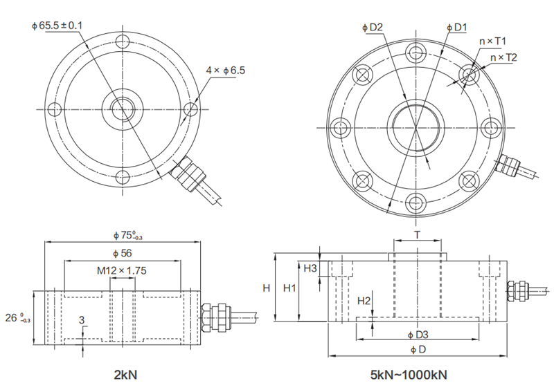 量程(kN) | 量程(t) | D | D1 | D2 | D3 | H | H1 | H2 | H3 | T | n×T1 | n×T2 |