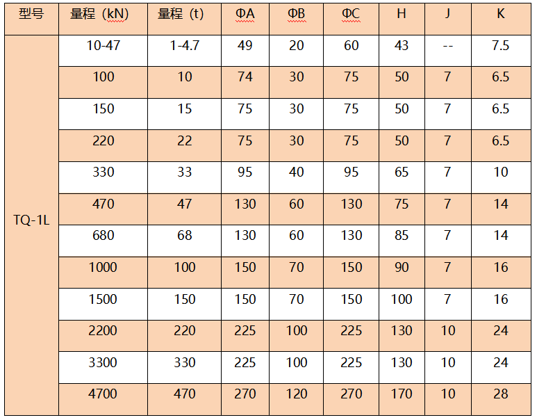 量程: 10kN(1t)、22kN(2.2t)、47kN(4.7t)、100kN(10t)、150kN(15t)、220kN(22t)、330kN(33t)、470kN(47t)、680kN(68t)、1000kN(100t)、1500kN(150t)、2200kN(220t)、3300kN(330t)、4700kN(470t)