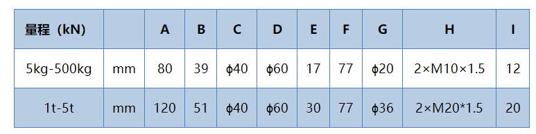 量程:5kg、10kg、20kg、50kg、100kg、200kg、250kg、500kg、1t、2t、3t、5t